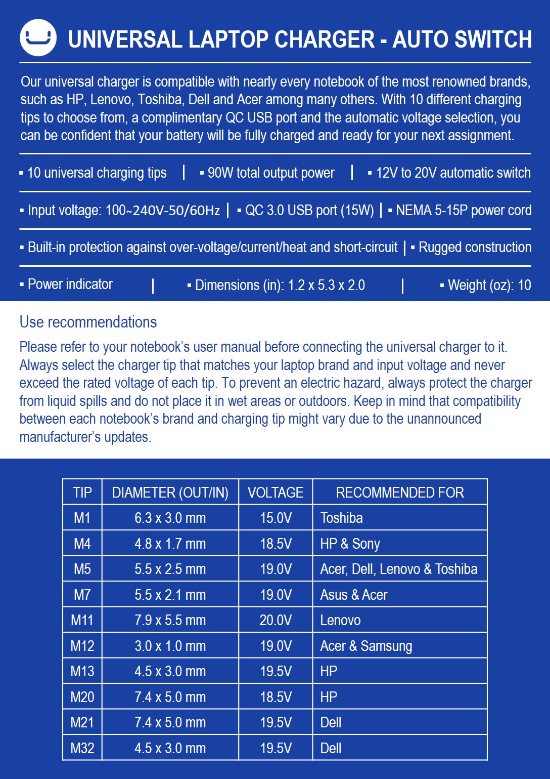 This universal charger is compatible with nearly every notebook of the most renowned brands, such as HP, Lenovo, Toshiba, Dell, and Acer among many others. With 10 different charging tips to choose from, a complimentary QC 3.0 USB port and the automatic voltage selection, you can be confident that your battery will be fully charged and ready for your next assignment.