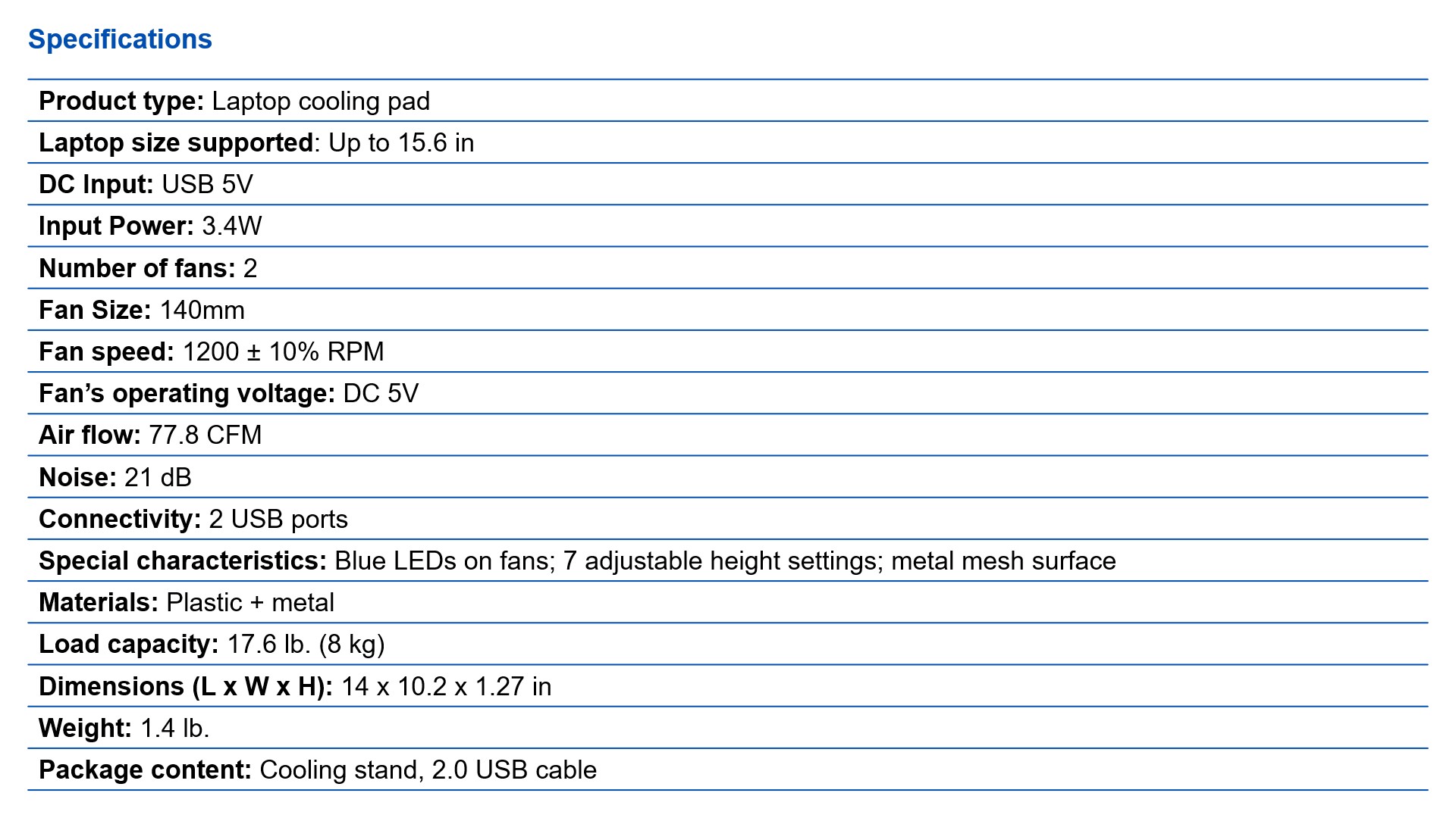 - Package content: Cooling stand, 2.0 USB cable
