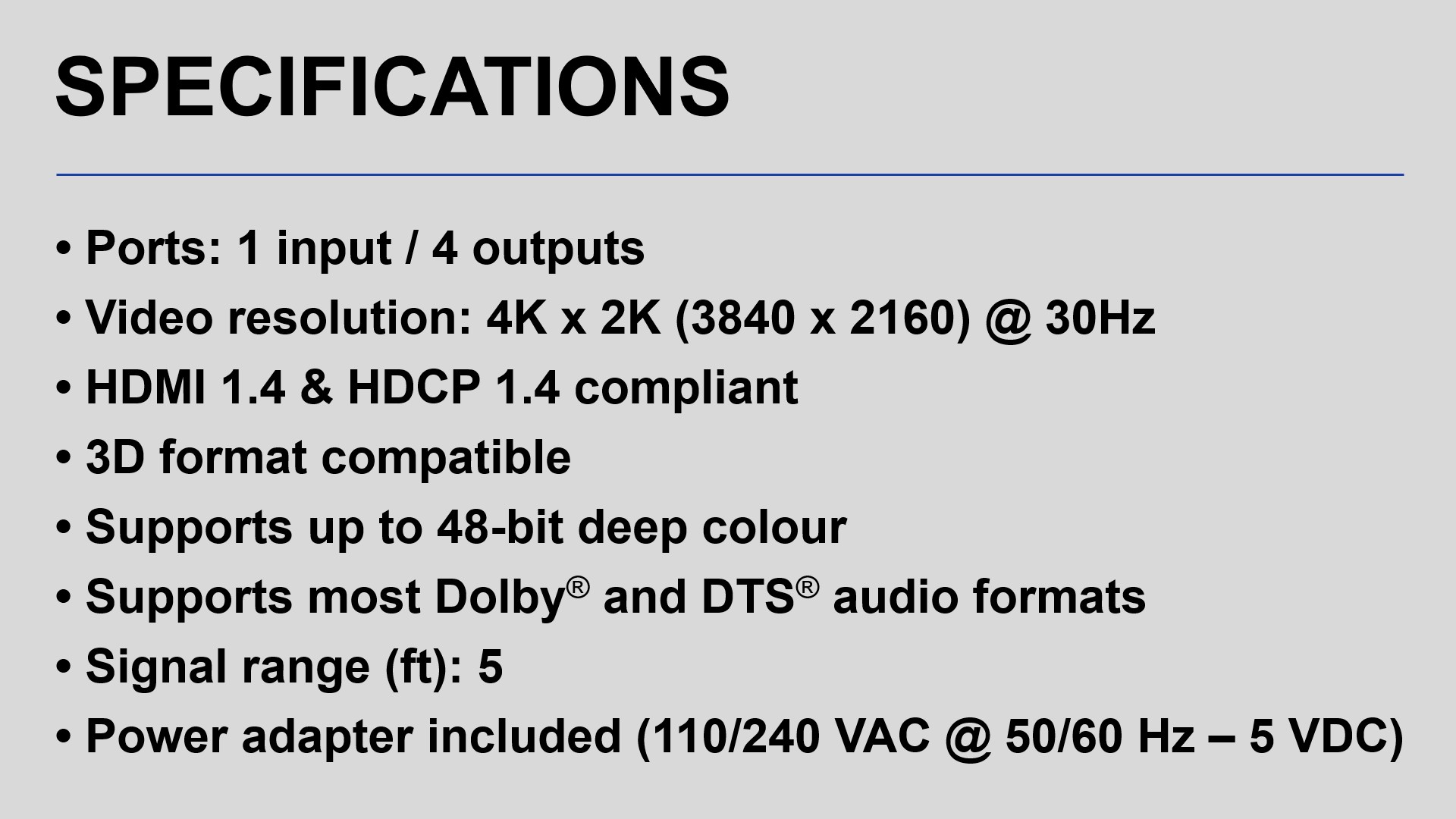 - Replicate a single HDMI signal in up to 4 HDMI displays