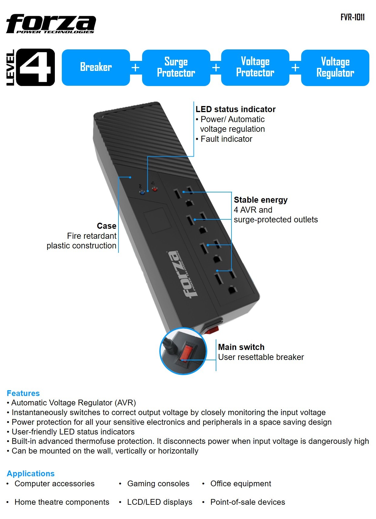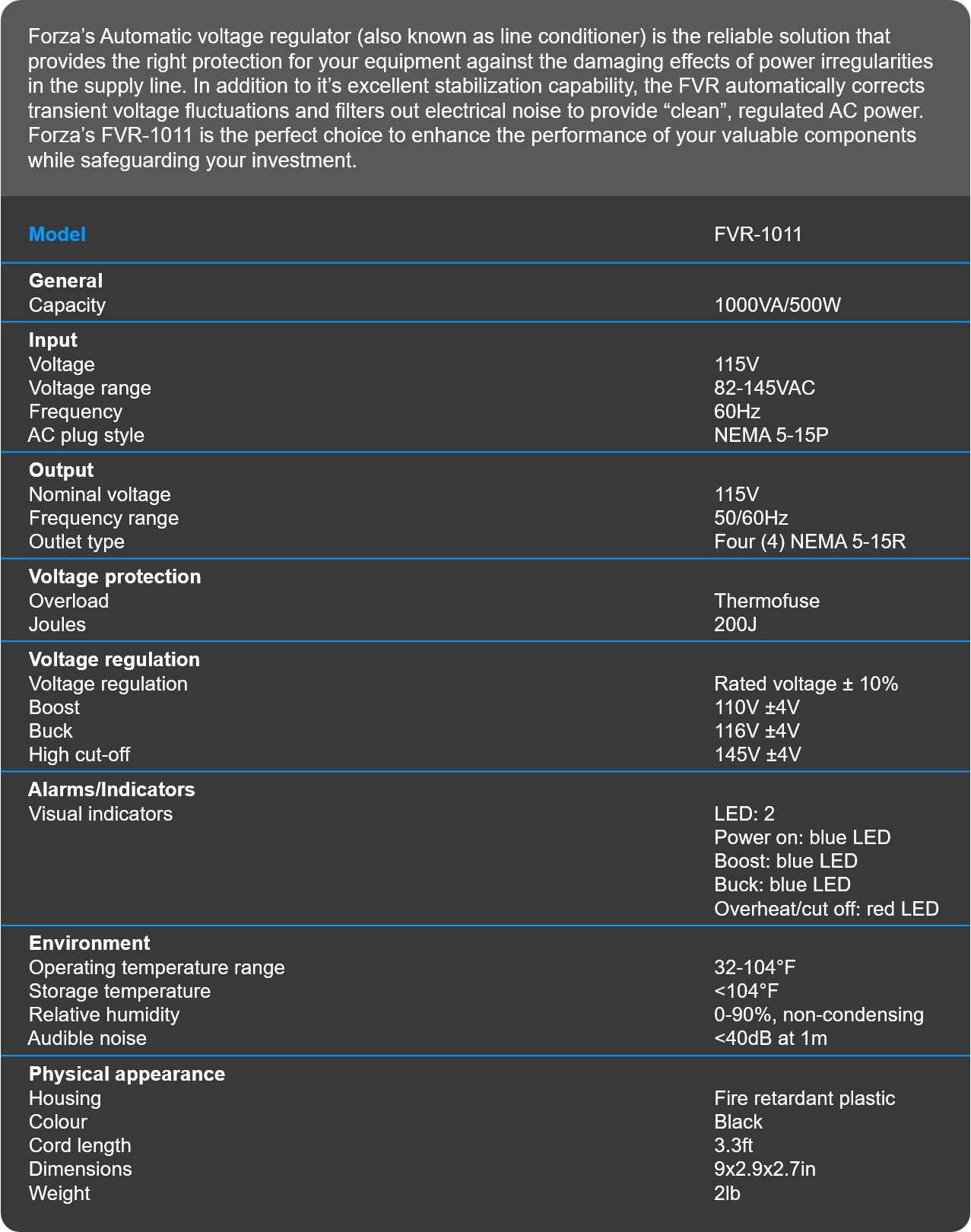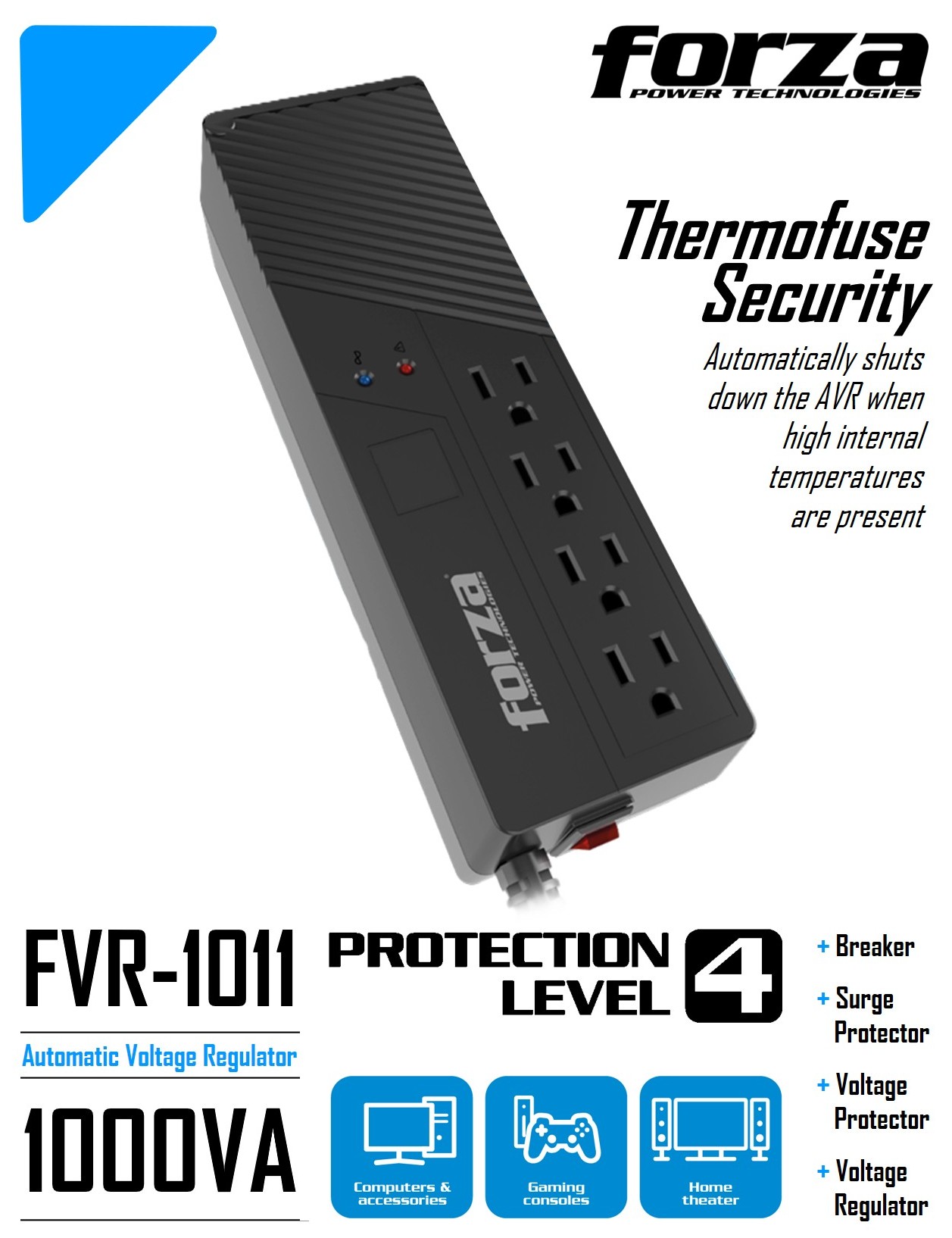 VOLTAGE REGULATOR | FORZA FVR-1011USB 1000VA/500WForza’s Automatic voltage regulator–also known as line conditioner–is the reliable solution that provides the right protection for your equipment against the damaging effects of power irregularities in the supply line.